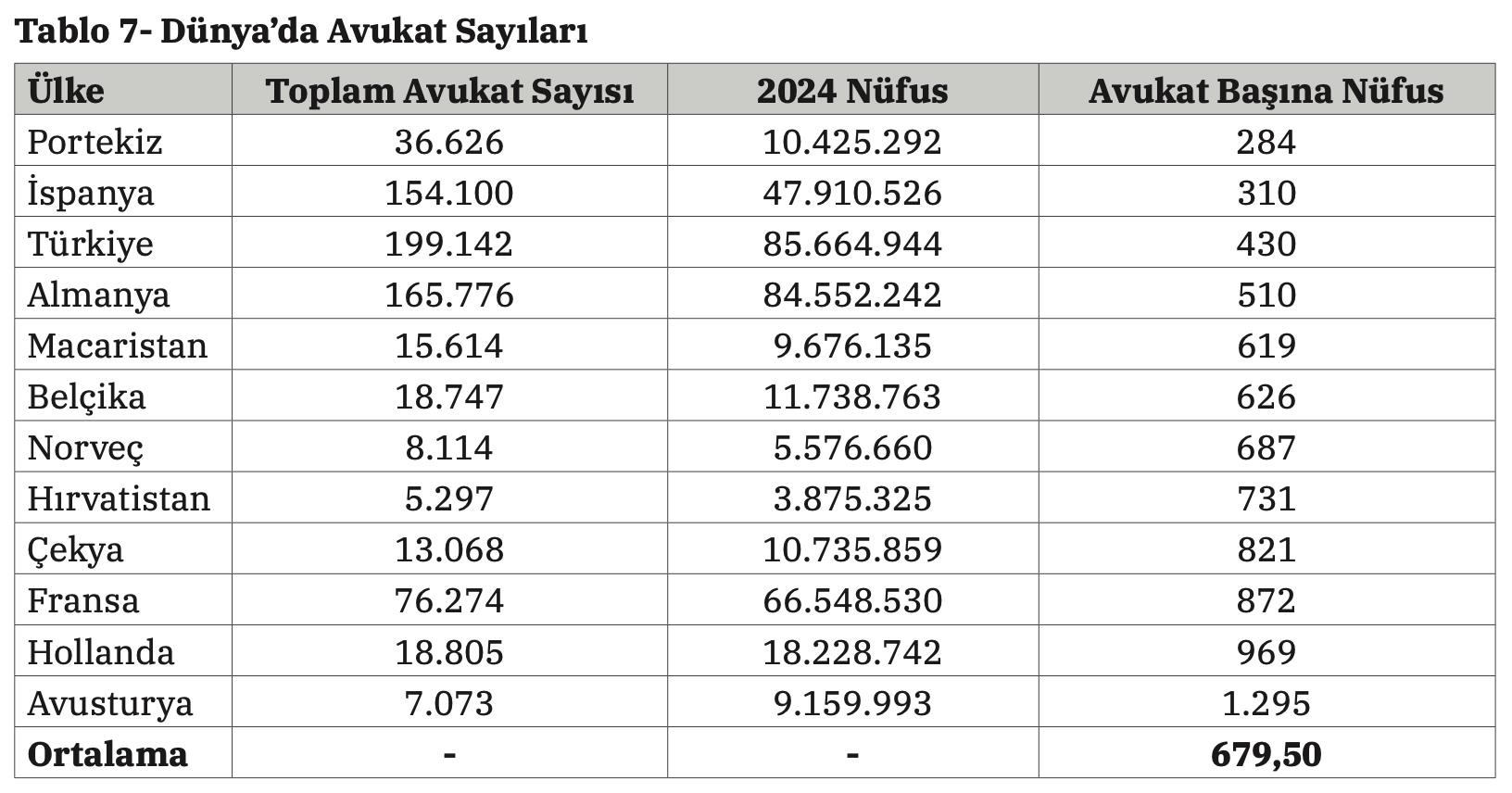 Avrupa ülkeleriyle yapılan karşılaştırmada Türkiye, avukat başına düşen nüfus açısından Portekiz ve İspanya’nın ardından üçüncü sırada yer aldı. İncelenen 12 ülkede ortalama avukat başına düşen nüfus 679 iken, Türkiye’de bu rakam 2024 günceliyle 430.