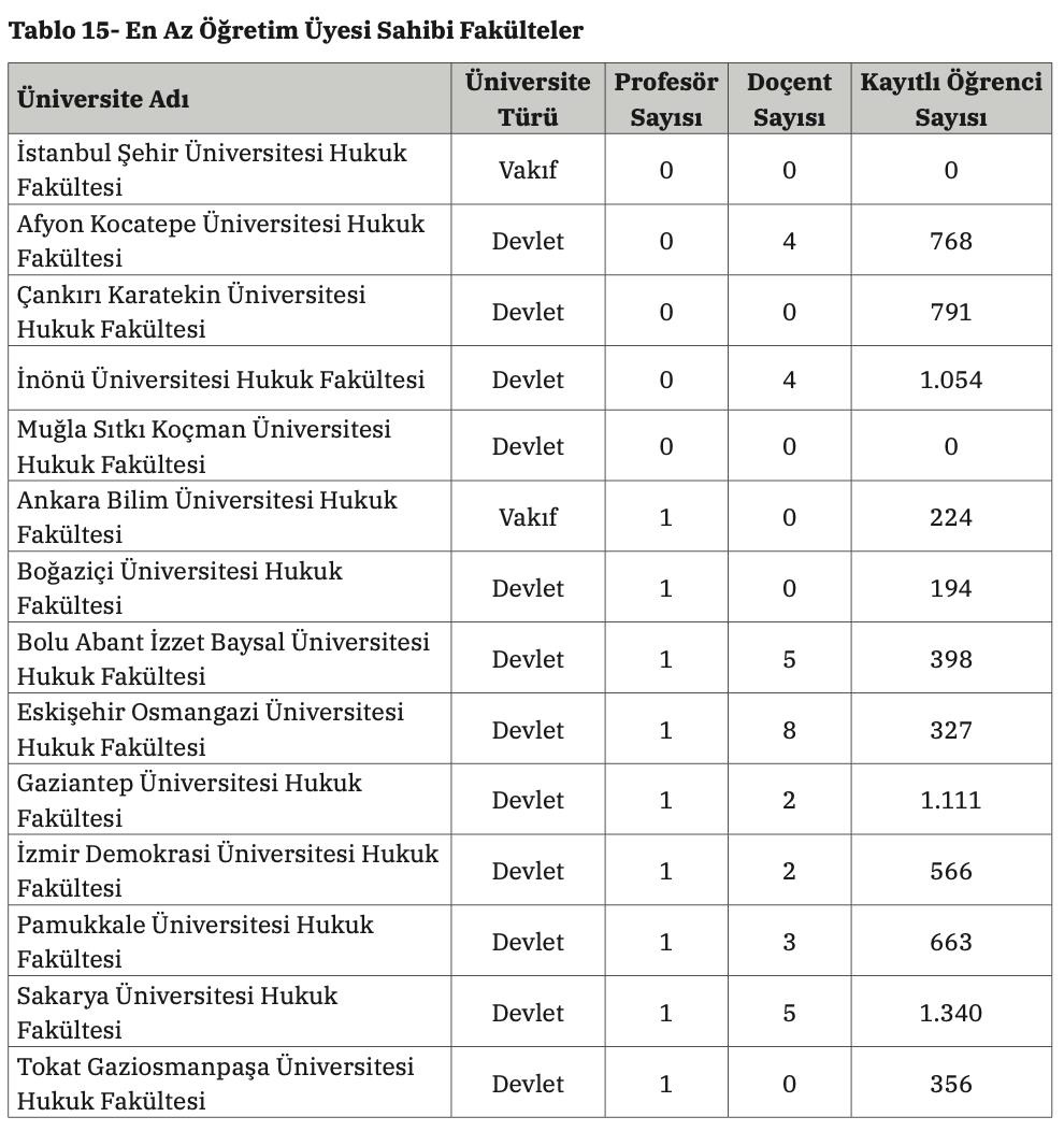 Raporda, öğretim üyesi sayısındaki artışa rağmen fakülteler arasında ciddi dengesizlikler bulunduğu da vurgulandı. Enstitü’nün çalışmasında, bazı hukuk fakültelerinde profesör sayısının sıfır ya da bir ile sınırlı olduğu, profesörlerin belirli üniversitelerde yoğunlaştığı tespit edildi.