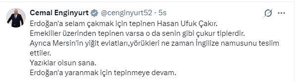 Enginyurt, Çakır’ın açıklamalarını hedef alarak, “Erdoğan’a selam çakmak için tepinen Hasan Ufuk Çakır” ifadelerini kullandı. Emekliler üzerinden siyaset yapılmasına sert çıkan Enginyurt, “Emekliler üzerinden tepinen varsa o da senin gibi tiplerdir” sözleriyle tepkisini dile getirdi.