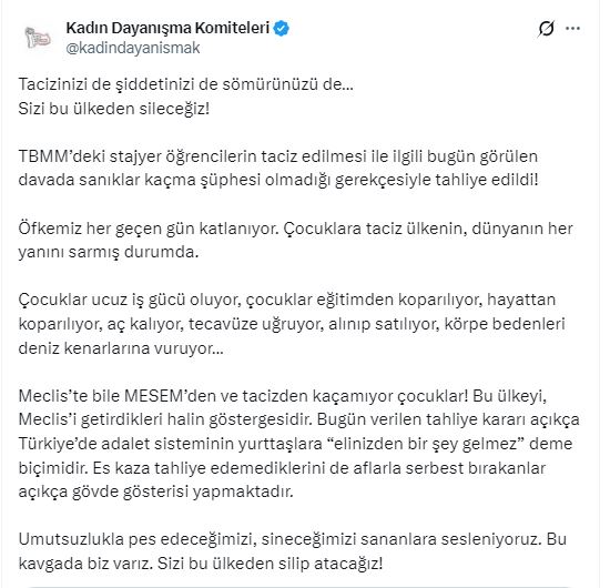 Kadın Dayanışma Komiteleri (KDK), TBMM lokantasında staj yapan lise öğrencilerine dönük istismar skandalıyla ilgili davada sanıkların tahliye edilmesi üzerine açıklama yaptı.