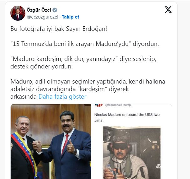 Maduro’nun alıkonulma anına ilişkin görsel üzerinden eleştirilerini sürdüren Özel, Türkiye’nin bu süreçteki sessizliğini “muhtaçlık” ve “çekince” olarak nitelendirdi: